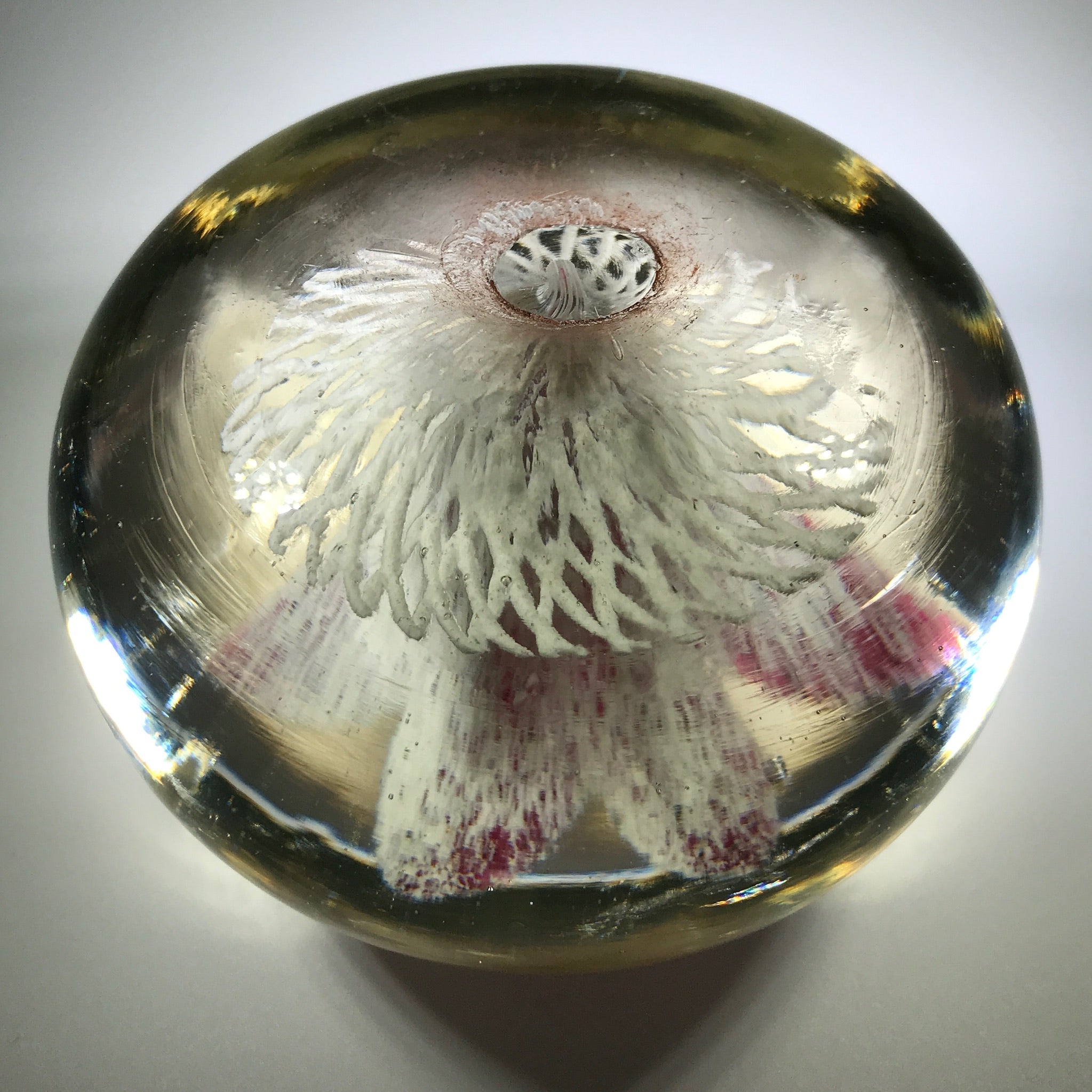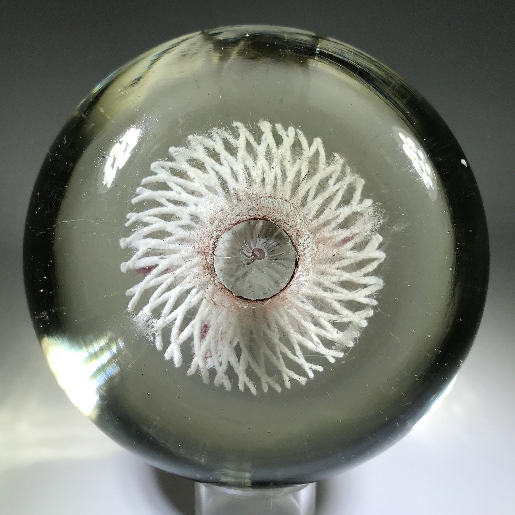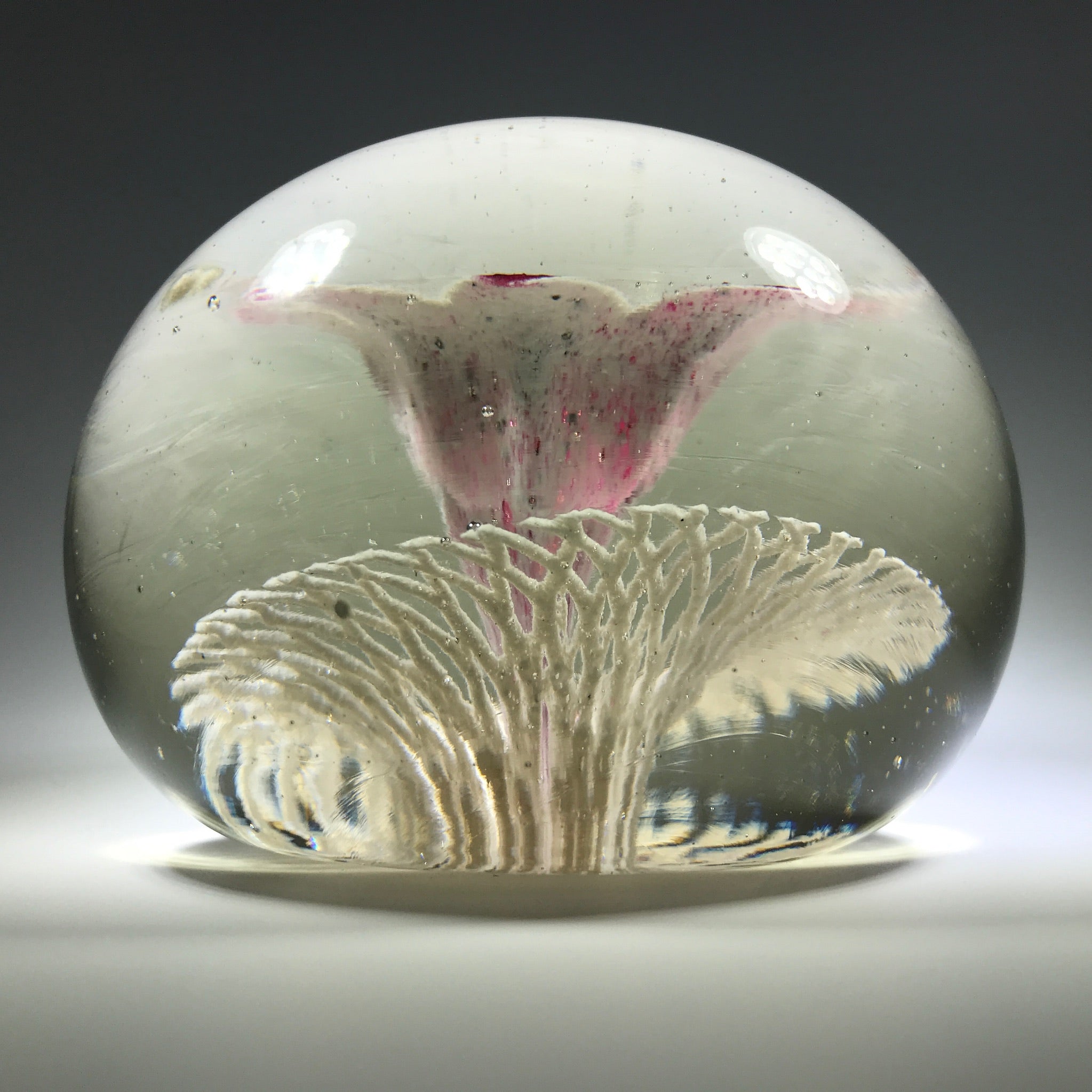 A very large rare design from an important early American paperweight artist. It features a large upright white lined maroon flower with a control bubble at the center. The flower hovers over an intricate frit lattice doily and the whole design is pulled to the base.