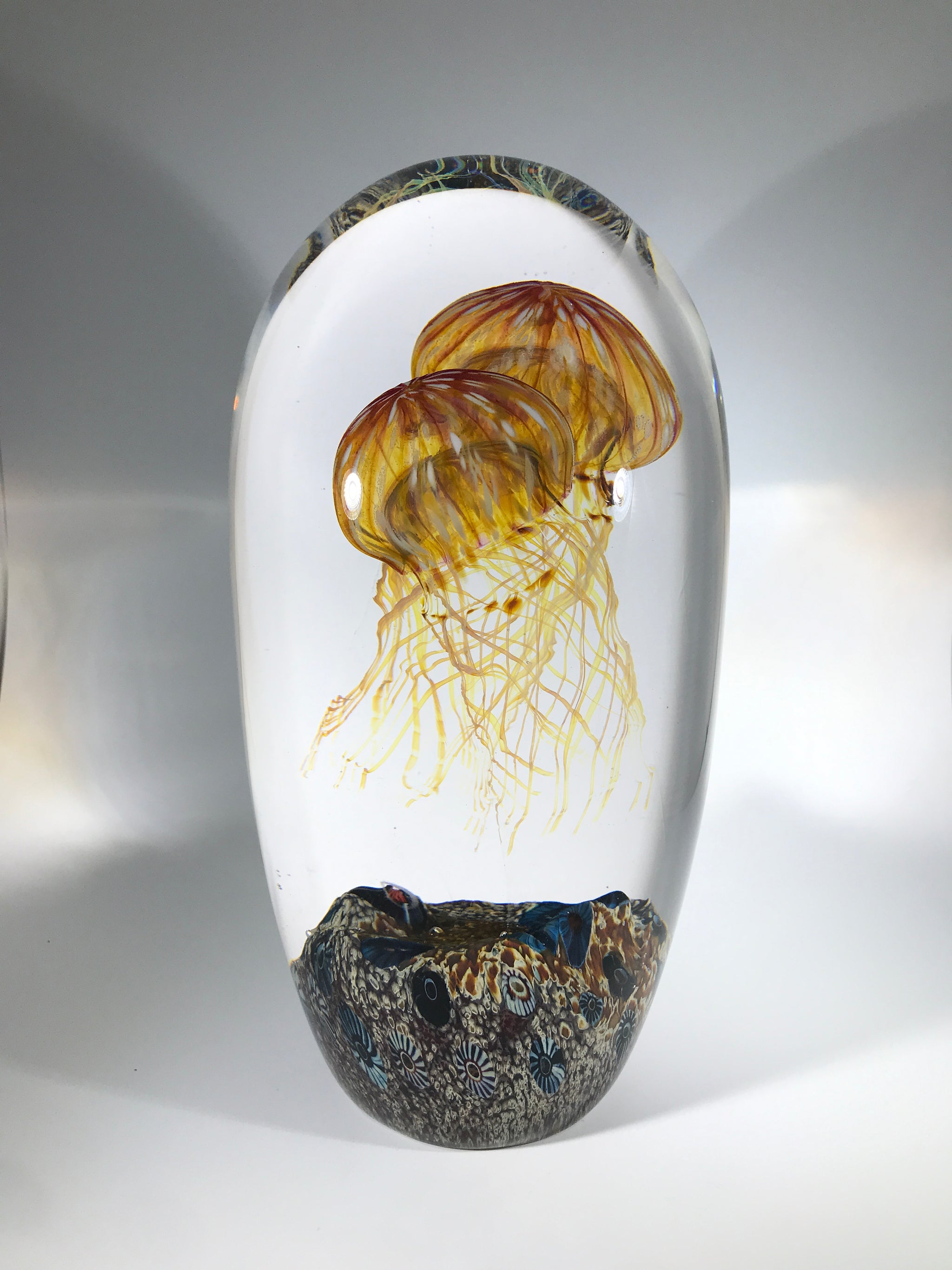 "How did they get those jellyfish in the glass?" "Poor things...thats animal cruelty." These are just a couple of the comments that one hears at shows from people whispering under their breath as they pass by. While they may look just like the real thing, these are in fact 100% glass and entirely handmade with molten hot glass. Yes, Satava's jellyfish are a marvel of modern glass artistry, taking him years to perfect. These hyper-realistic glass sculptures are second to none. So captivating and sought after by the collectors around the world the grace of these jellyfish are one of the most copied works in modern art glass - though no artist has come close. Satava's jellyfish are hands down the most graceful, realistic, and elegant of all jellyfish ever executed in glass. Satava has made these jellyfish in a number of sizes from 5" tall up to 12"+. This is one the larger examples and I find the double jellyfish particularly attractive with the elegant dance of the two, gracefully rising from a barnacle scattered seafloor.