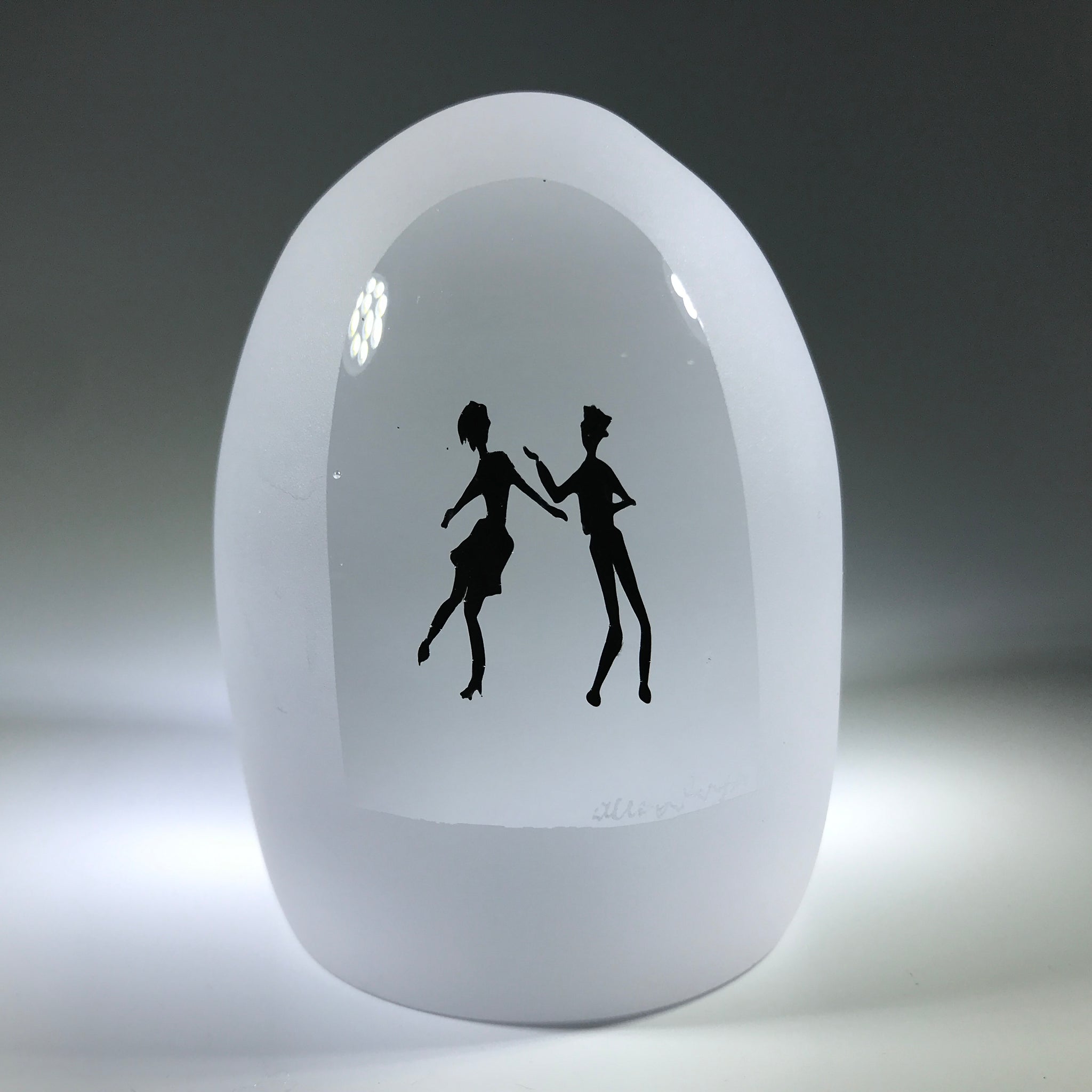 A wonderful piece and a very interesting example of a rarely seen glass technique. Ms. Ruzsa captures detailed moments like that seen here by hand-painting the image with enamel paints and then encasing the image in molten glass, it is a time consuming and difficult process. This example features a young couple enjoying an evening, dancing - as if no-one is watching. The work is finished with matte surface with exception of one viewing window revealing the detailed image captured within.