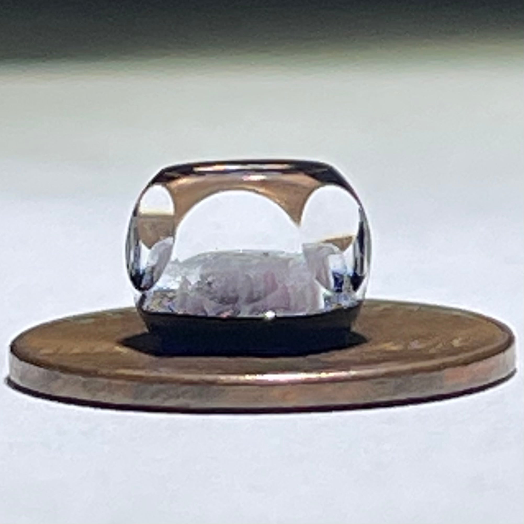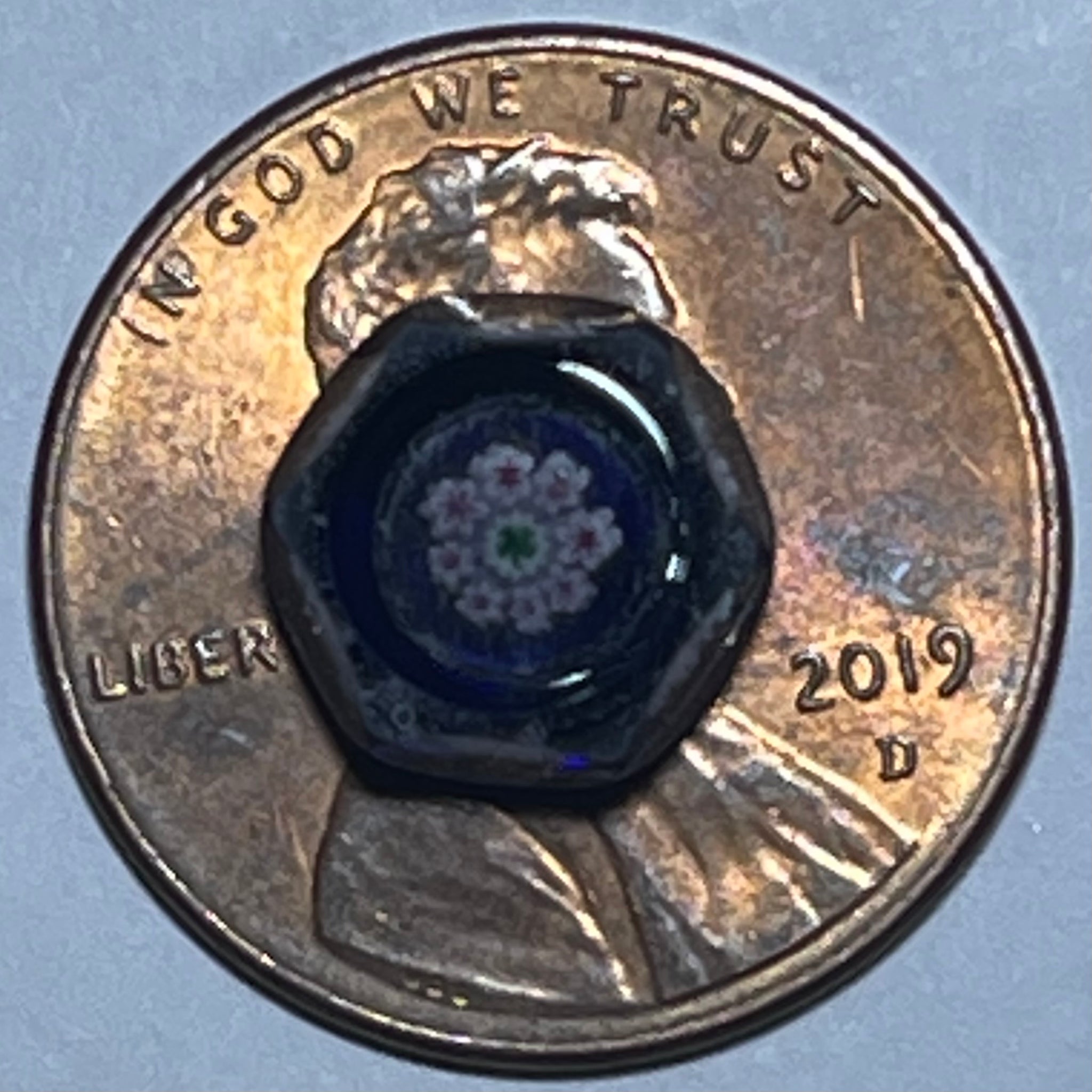 Possibly the worlds smallest paperweight featuring a single complex cane with a central Clover silhouette over transparent blue. Finished with 6+1 faceting.