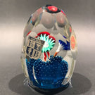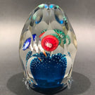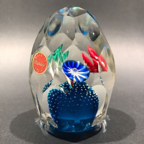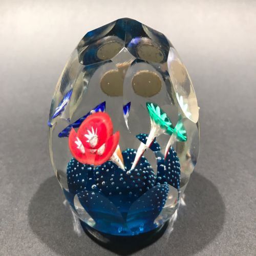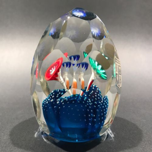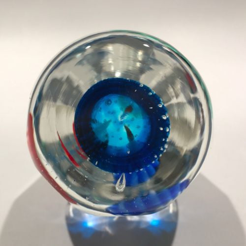 A large update weight with three millefiori (turquoise, blue, & red) blossoms rising from a transparent blue cushion which has a grid of evenly placed micro control bubbles. Finished with four levels of well calculated faceting.