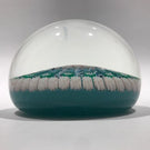 An open “wagon wheel” style design with 15 ribbon twists radiating from a central concentric millefiori motif and and outer row of white millefiori and green millefiori alternating at the ends of the twists, set on an opaque turquoise blue ground.