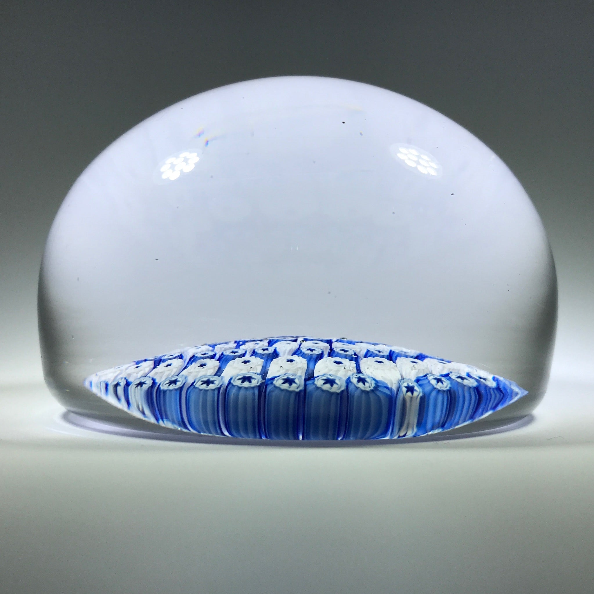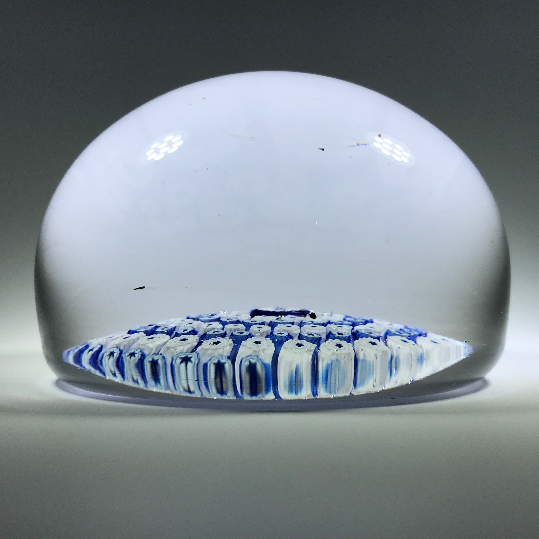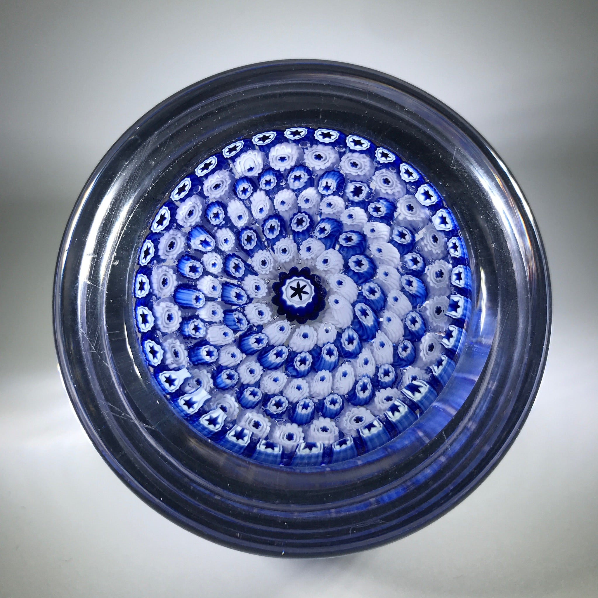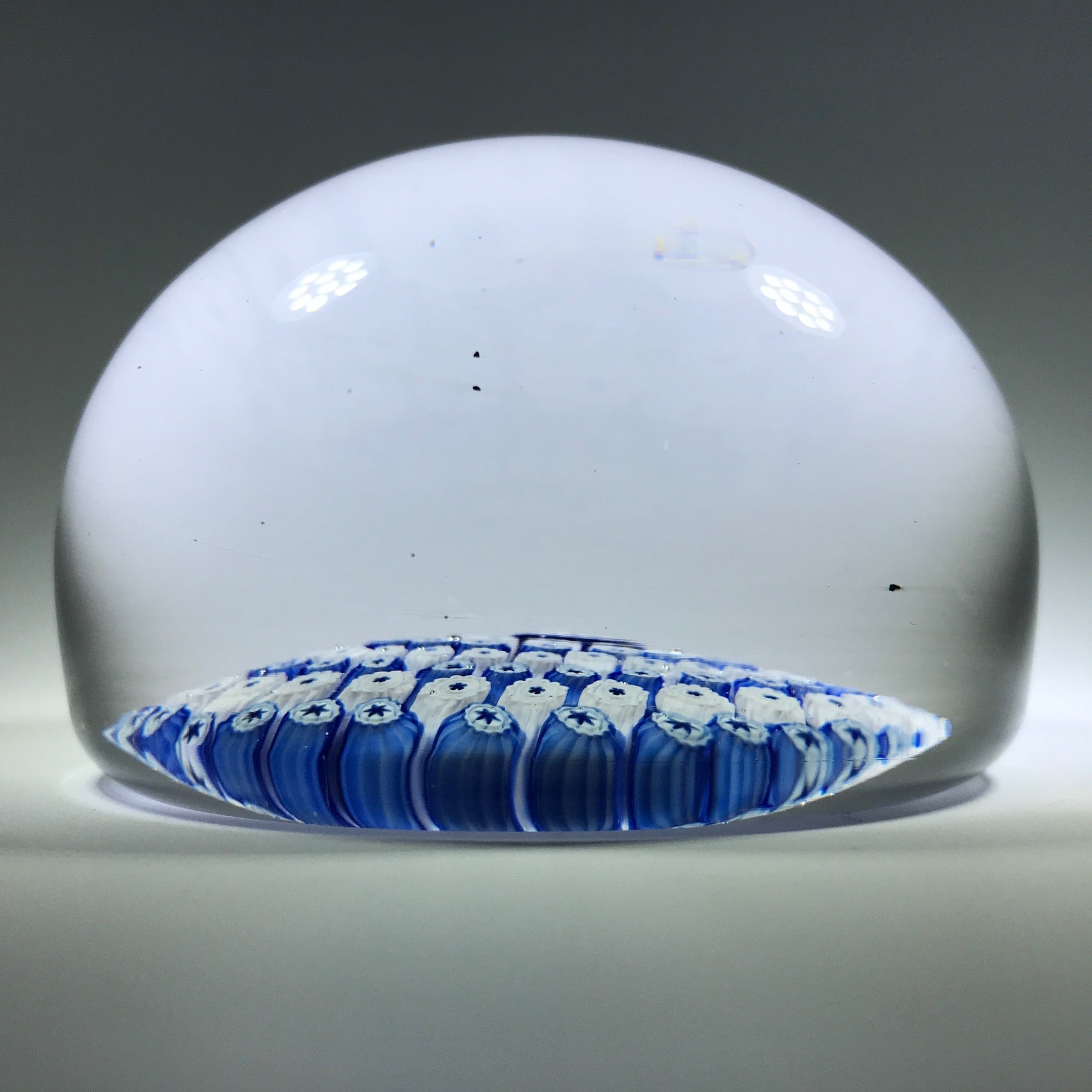 A handsome example with closely-packed concentric rows of alternating blue and white millefiori on a clear ground.