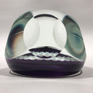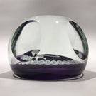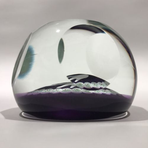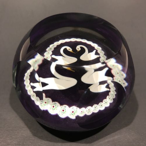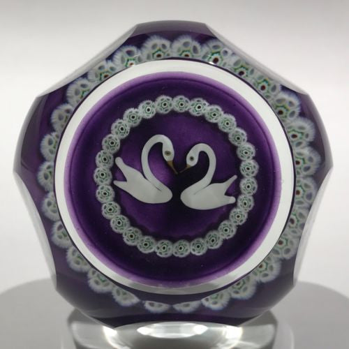 On a translucent purple cushion, at the center a pair of swans facing one another with their heads in the downward position forming a heart with their elegant necks. The lampwork in the swans is quite detailed with yellow bills and even iris’ in each eye. A garland of complex millefiori runs the outer circumference and the weight is finished with 5+1 faceting. Limited to just 150 pieces!