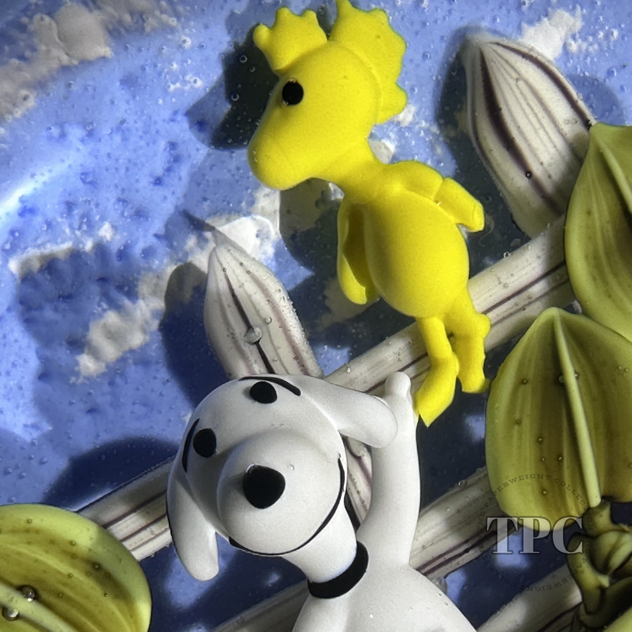 Snoopy and Woodstock celebrate finding the perfect pumpkin for their jack-o-lantern surrounded by large orange pumpkins a picket fence and fall leaves scattered on the ground.