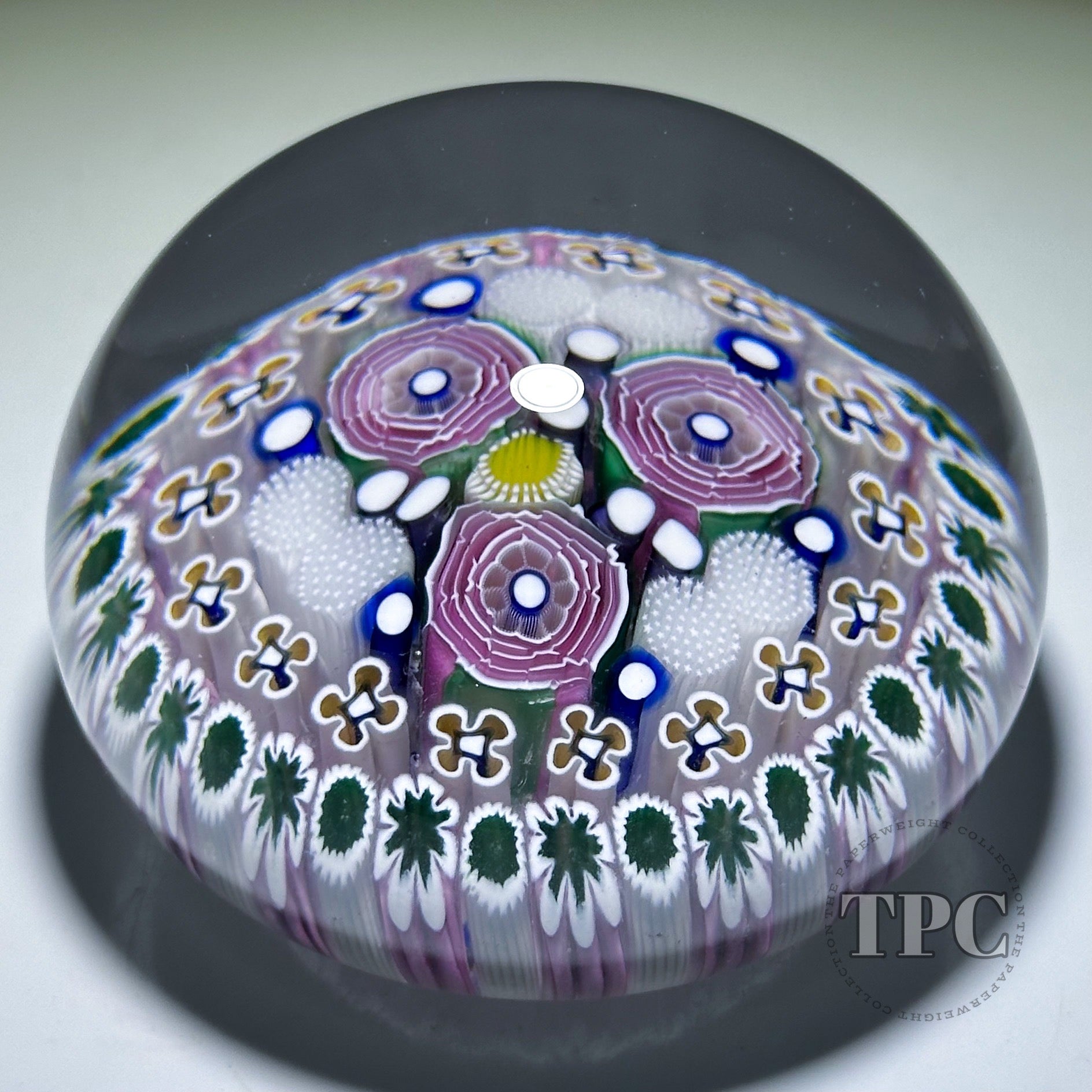 A unusual concentric featuring two rows of millefiori around a center motif focused on three large Clichy style roses compliments tubes and white stardust canes embraced by basket of staves formed from the outer row of pink, white and green ruffled millefiori.