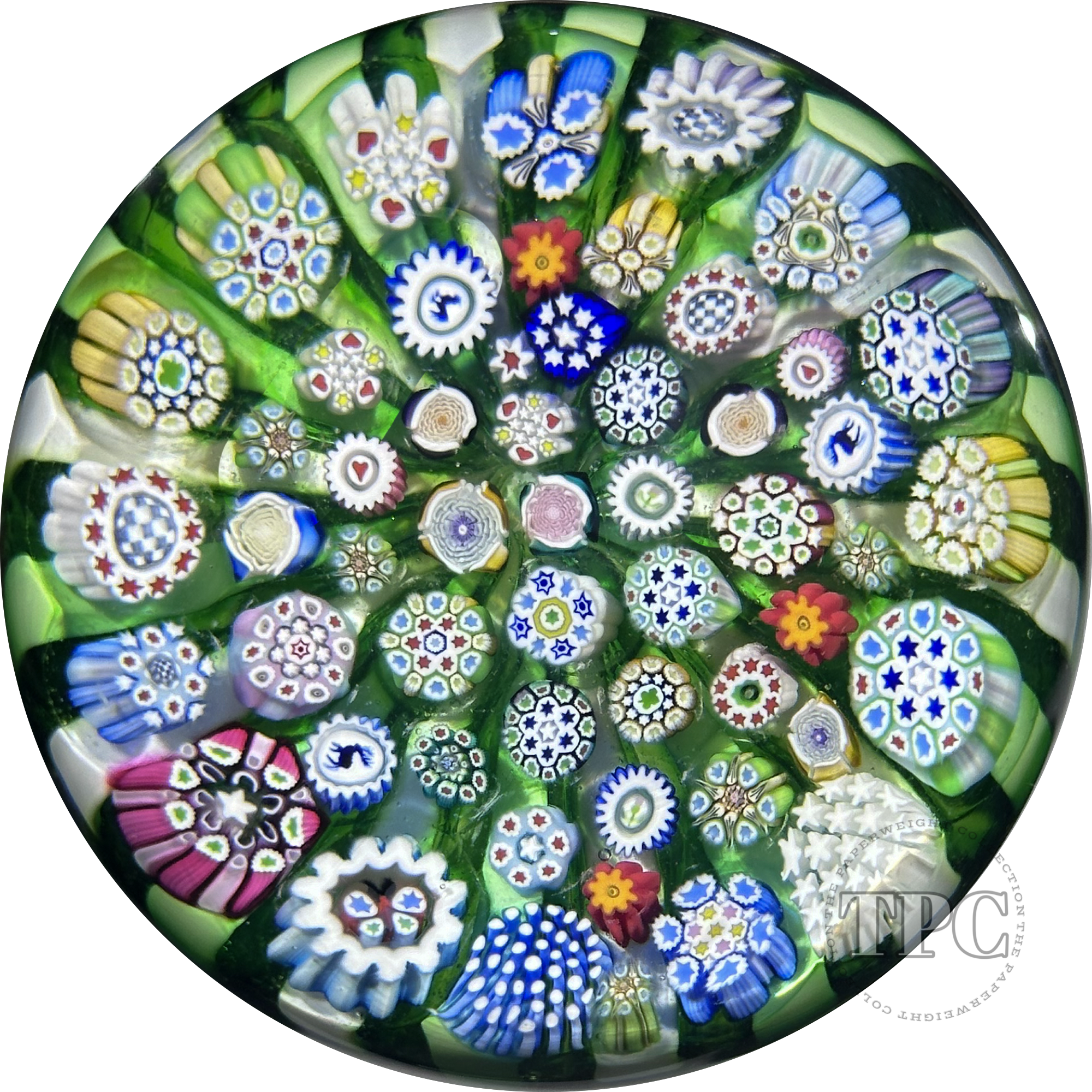 John Deacons Glass Art Paperweight Closepack Complex Millefiori with Silhouettes on Radial Green & White Cushion