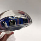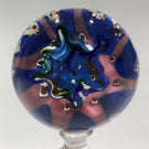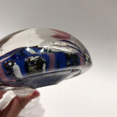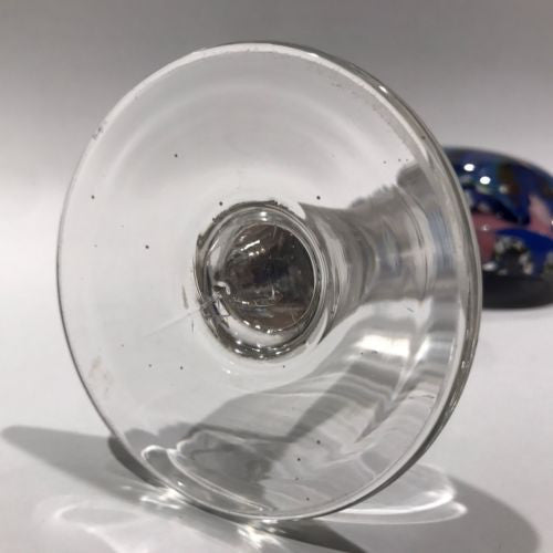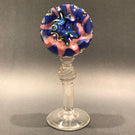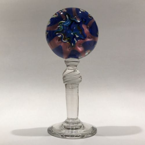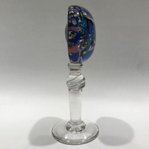 A beautiful and unusual piece of purple and blue with colorful frit decoration, set on its side and resting on a clear stem with twisted decoration.