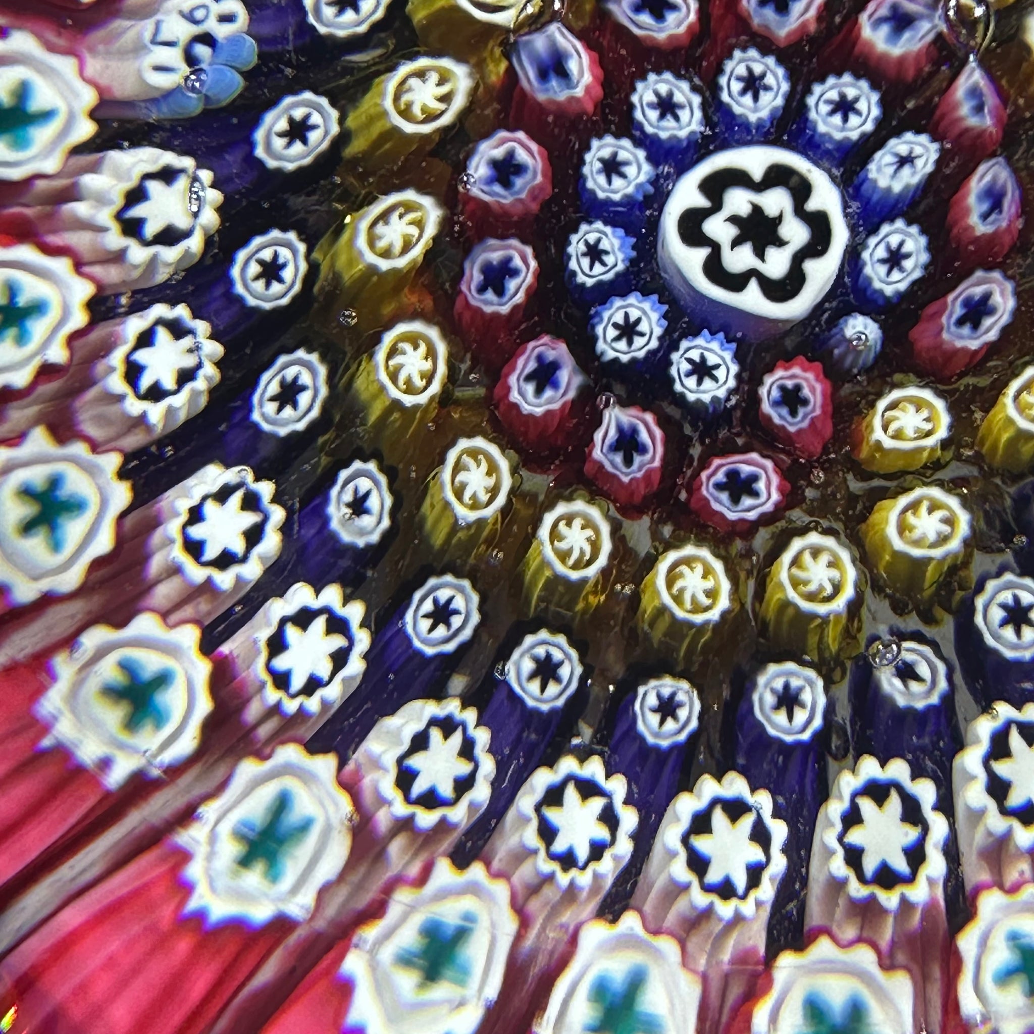 Concentric rows of colorful star-centered millefiori in red, white, yellow and blue.